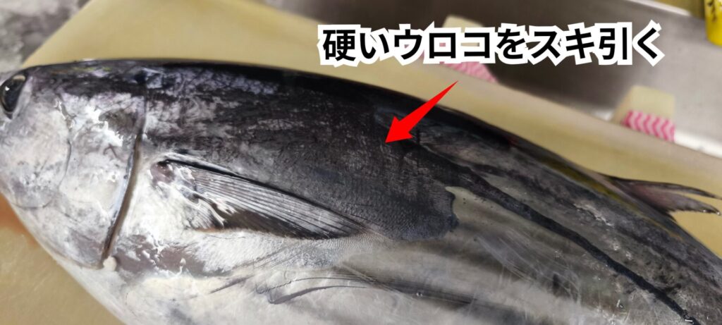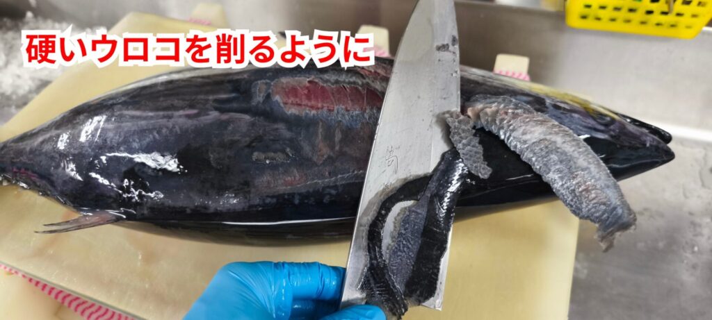ヒラメやカレイ、ブリのようにスキ引くことで硬いウロコを外していきます。
