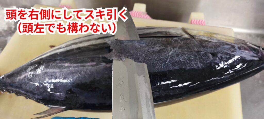 おいらは頭を右に向け、尾を持ちながらスキ引くことに慣れています。頭は左向きでも構わないから、やりやすい方でやりましょう。