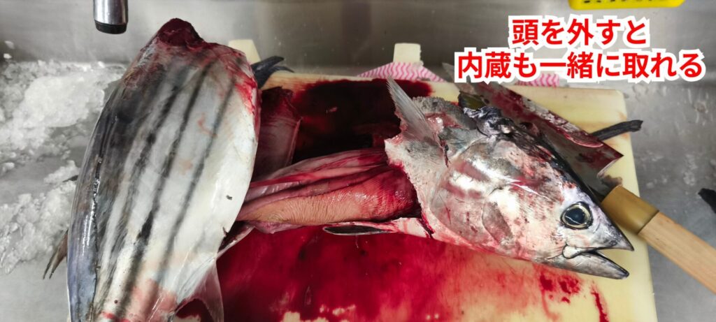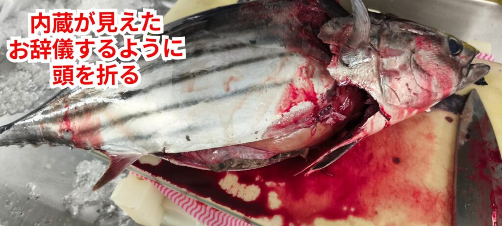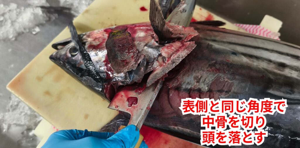 スキ引きができたら頭を左に向け、スキ引いたウロコの下から斜めに頭を落とします。