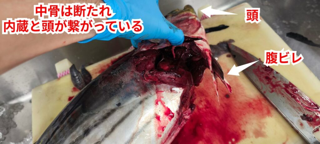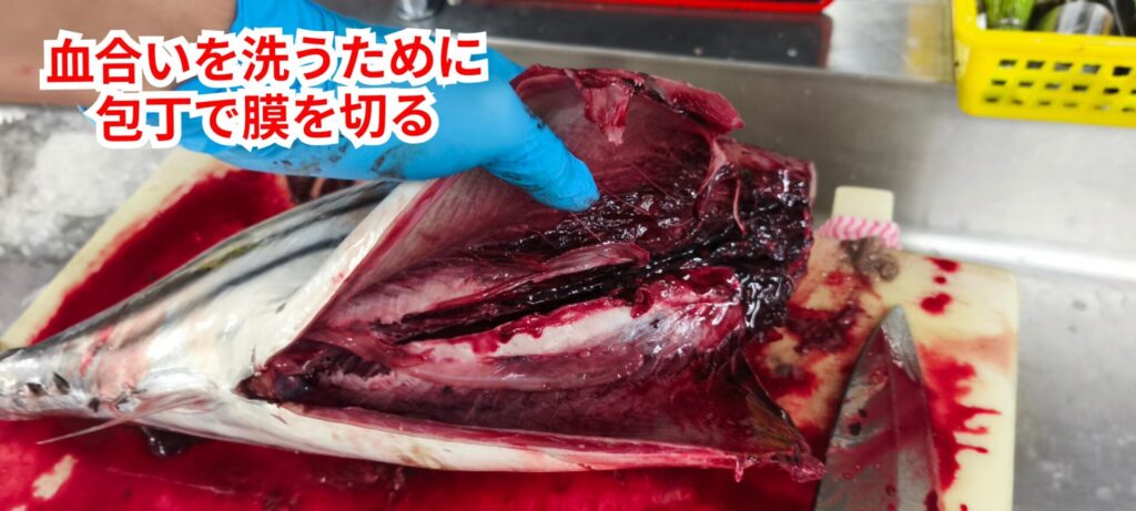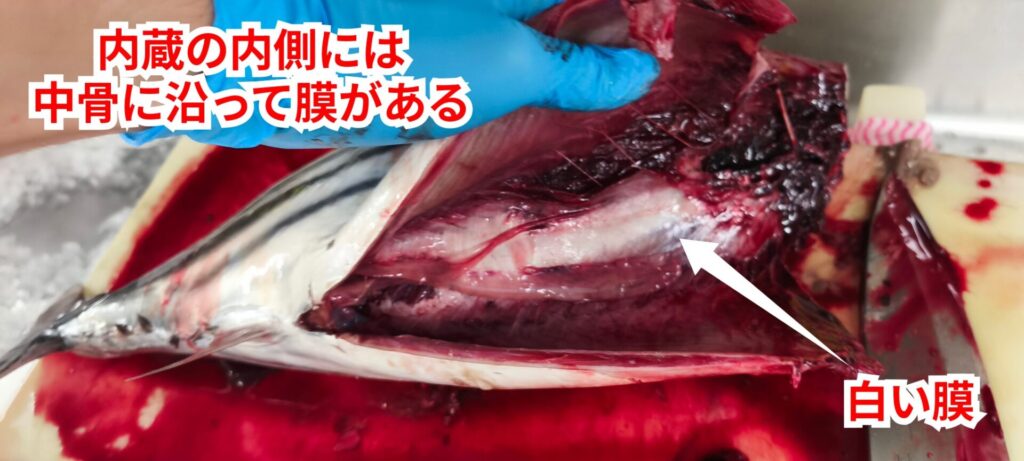 内蔵を除けた腹の中には、浮袋(白い膜)があり血合いが掃除できません。