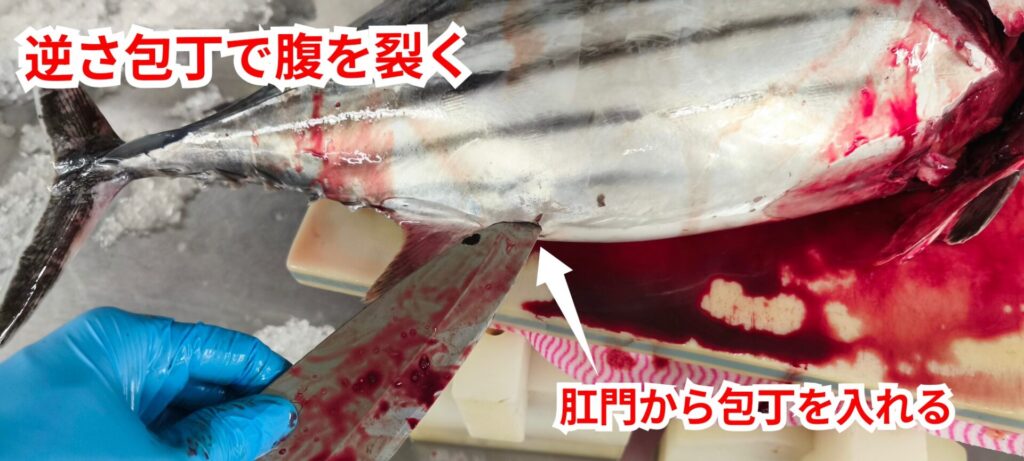 お腹側の穴(肛門)から逆さ包丁を入れて、腹を頭まで切り裂きます。