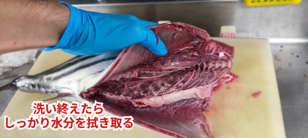 しっかりとタオルで水気を拭き取り、「水洗い」といわれる下処理は終わりです。