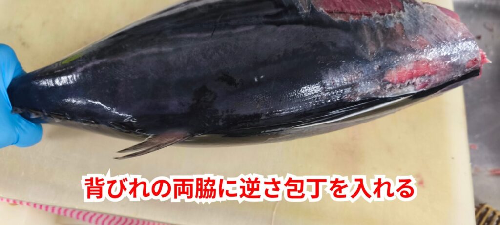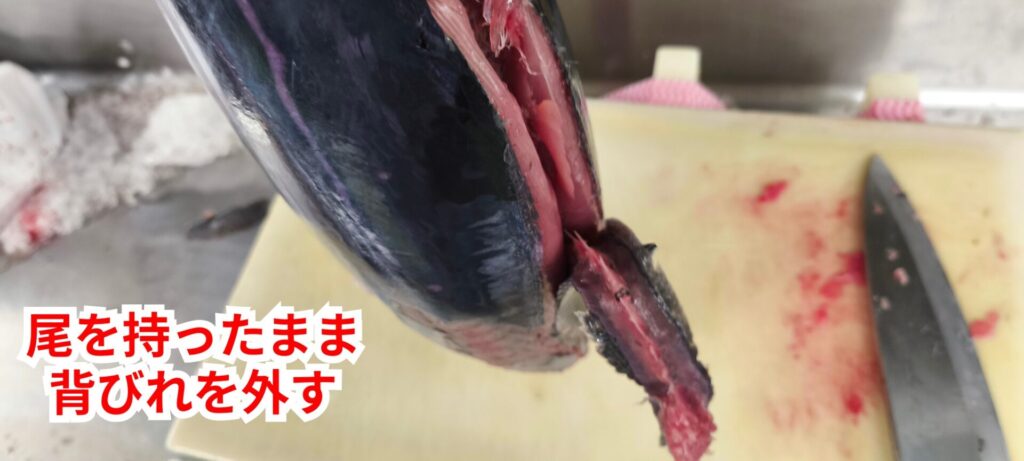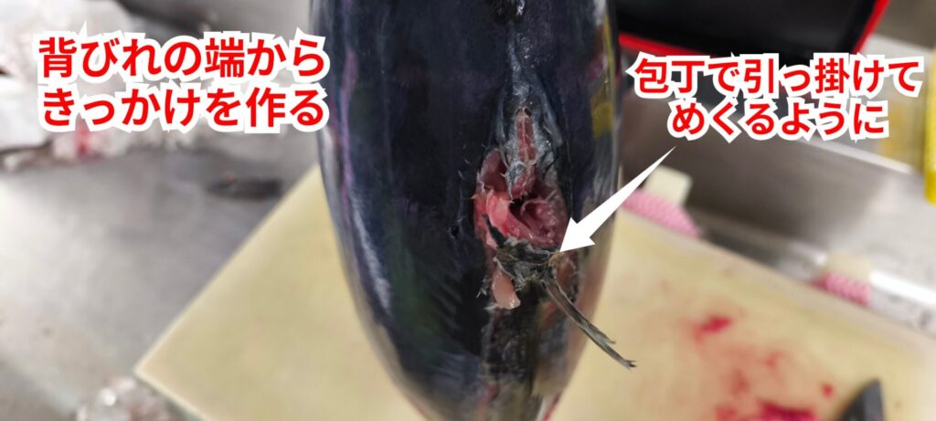 両側に逆さ包丁が入ったら、尾寄りの背ビレから包丁を入れて背ビレを丸ごと外します。