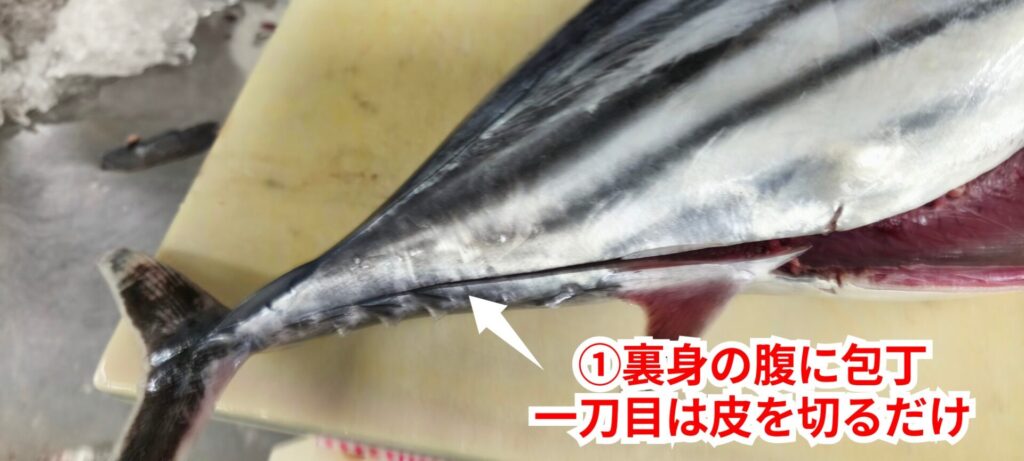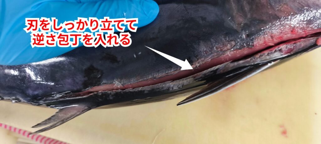 反対側に逆さ包丁を入れる時は、尾をしっかり持ちカツオを立てます。