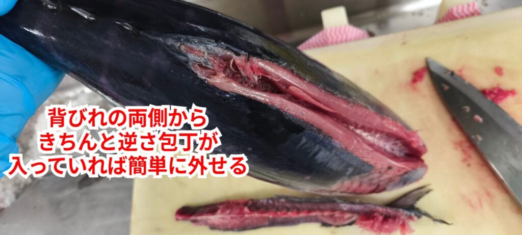 背ビレの両側から、逆さ包丁で切り込みを入れると簡単に外せます