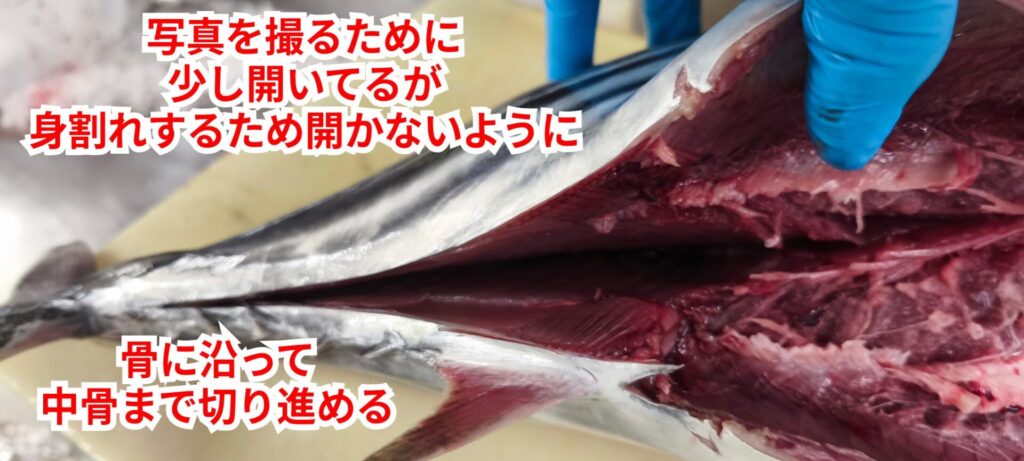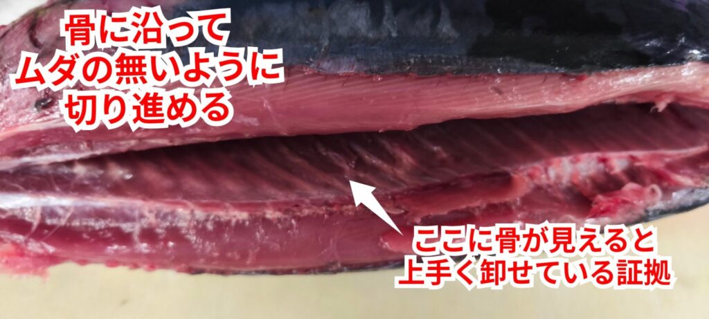 骨に沿って切り、中骨まで到達するように。骨に身を残らさないようにします。