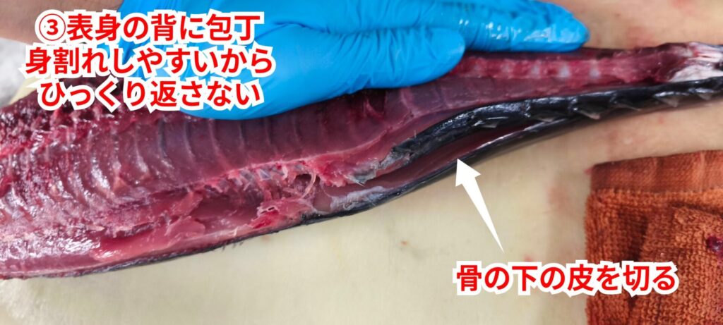 身割れしやすい魚は(サーモン、サワラなども)、ここでひっくり返さずに、そのまま表身を卸していきます。