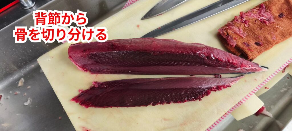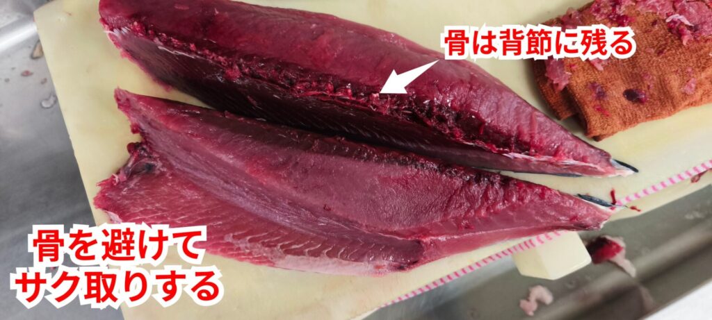 カツオの骨は、大きく抜きにくく、身割れもしやすいのでサク取りして切り取ります。