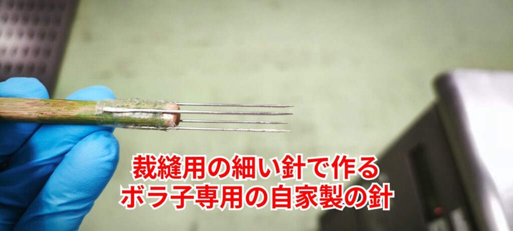 割り箸の先端に裁縫用の針を固定して作成しています。使用前には、熱湯とアルコールで消毒します。