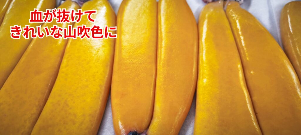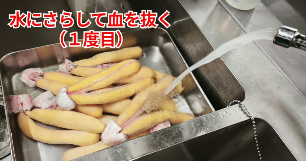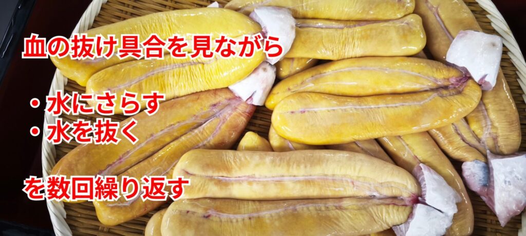 「血抜き」は、最も手間がかかり、面倒な作業です。しかし、仕上がりを左右するとても大切な工程であるため手抜きは厳禁。