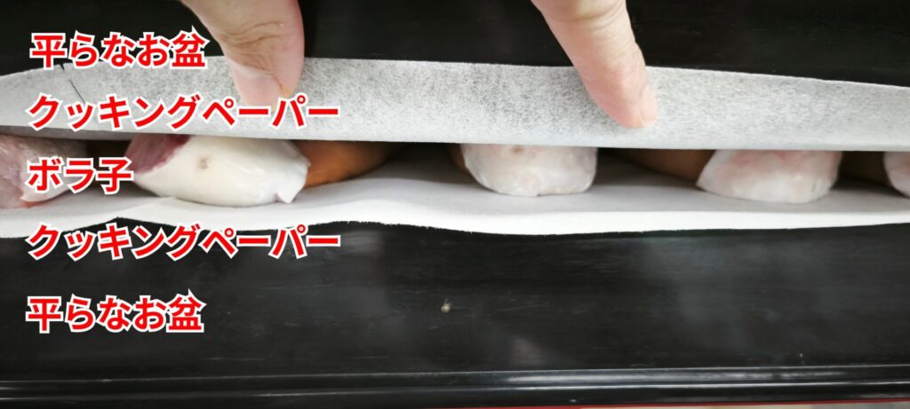 成形とは、平らなガラス板やお盆などでボラ子を挟み適度な重しをして冷蔵庫で一晩過ごします。