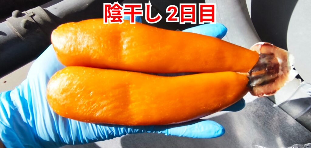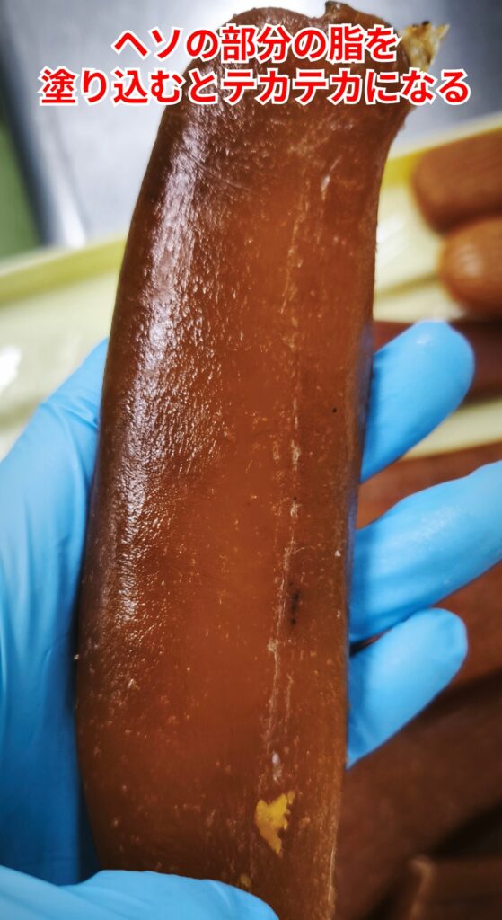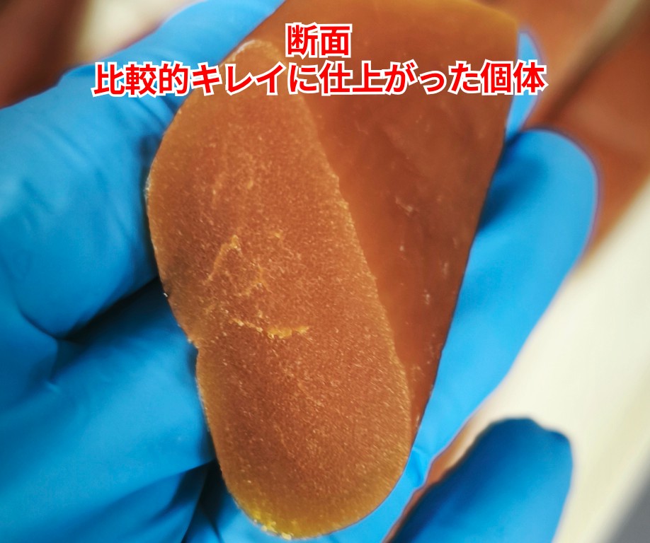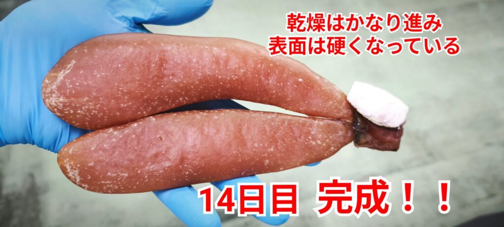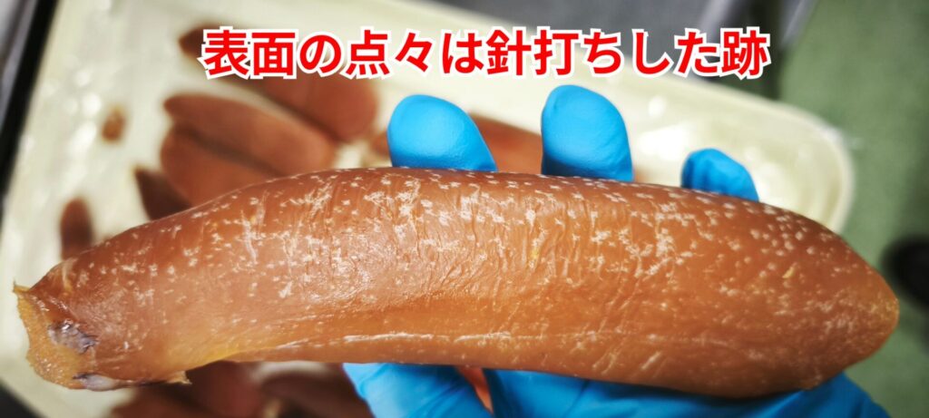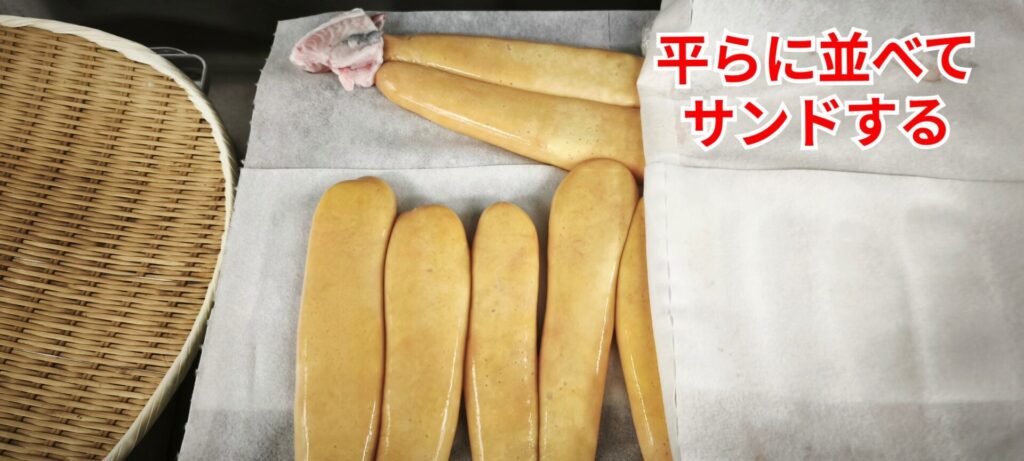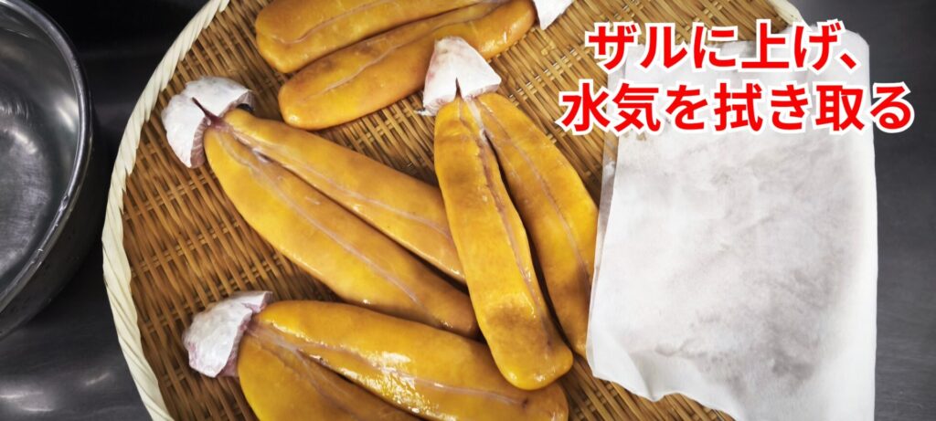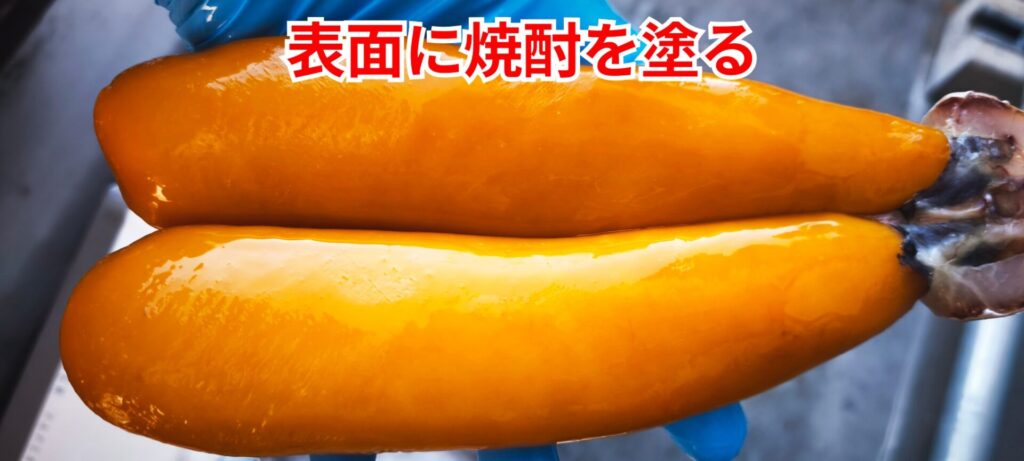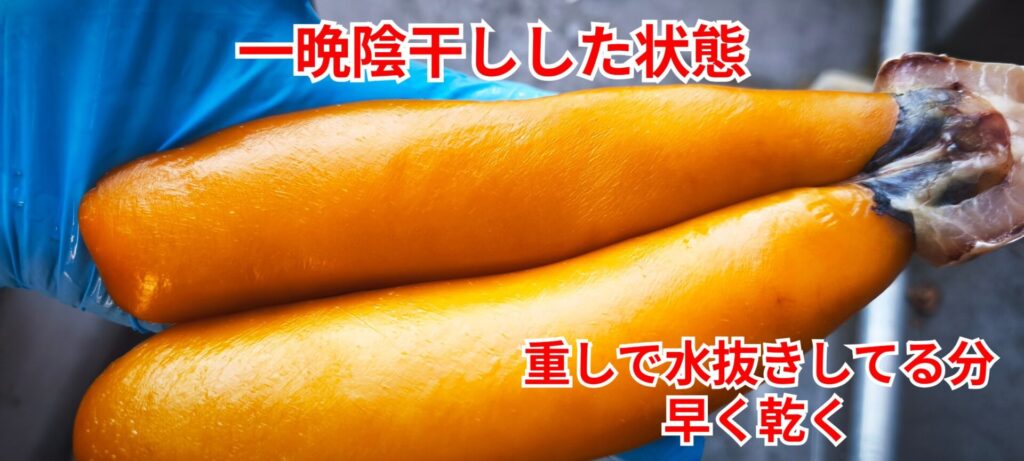 ※「硬くなる」とは脱水前と比較して、ということです。乾燥前のボラ子はいずれも柔らかく、簡単に薄皮が破けるので、取り扱いには細心の注意を払いましょう。