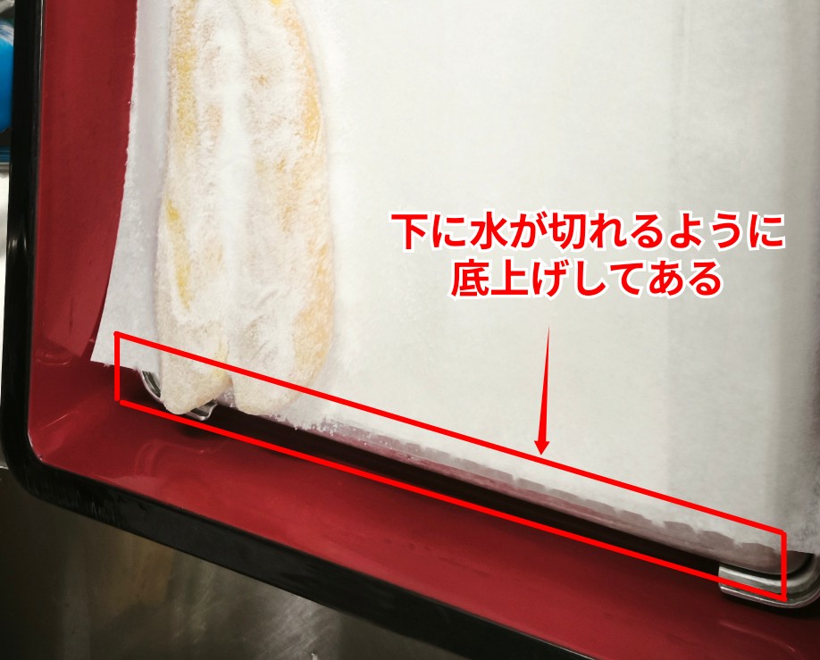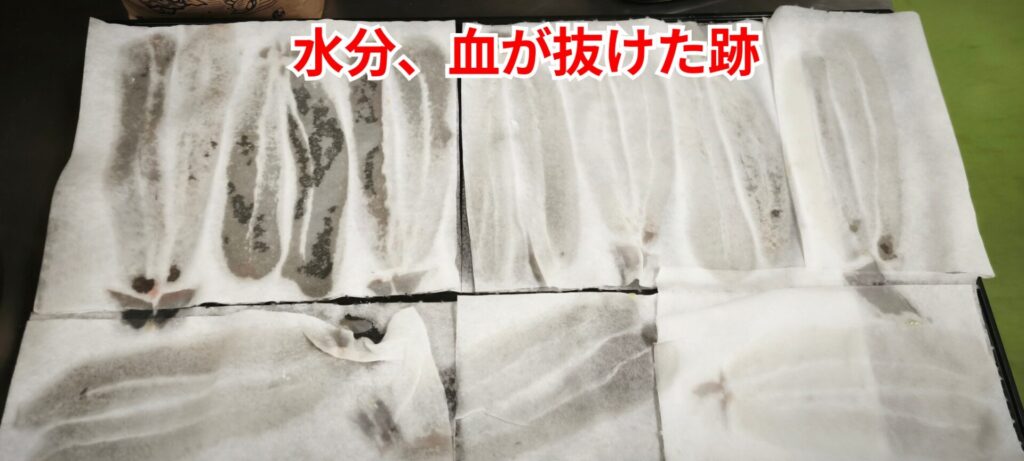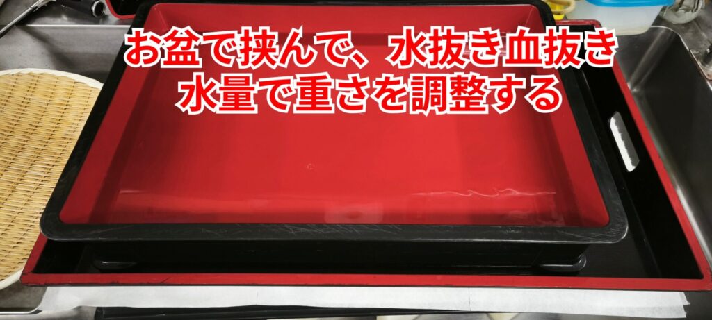 サンドしたまま1時間ほど置きます。血が水と共に薄皮から押し出されます。