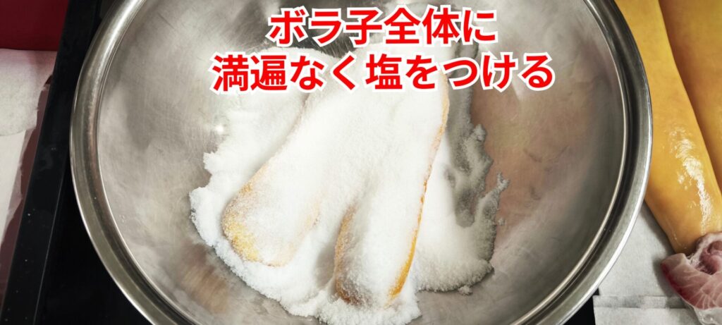ボウルに塩をたっぷり用意して、ボラ子を一腹ずつ移します。全体的に塩をまぶしていきます。
