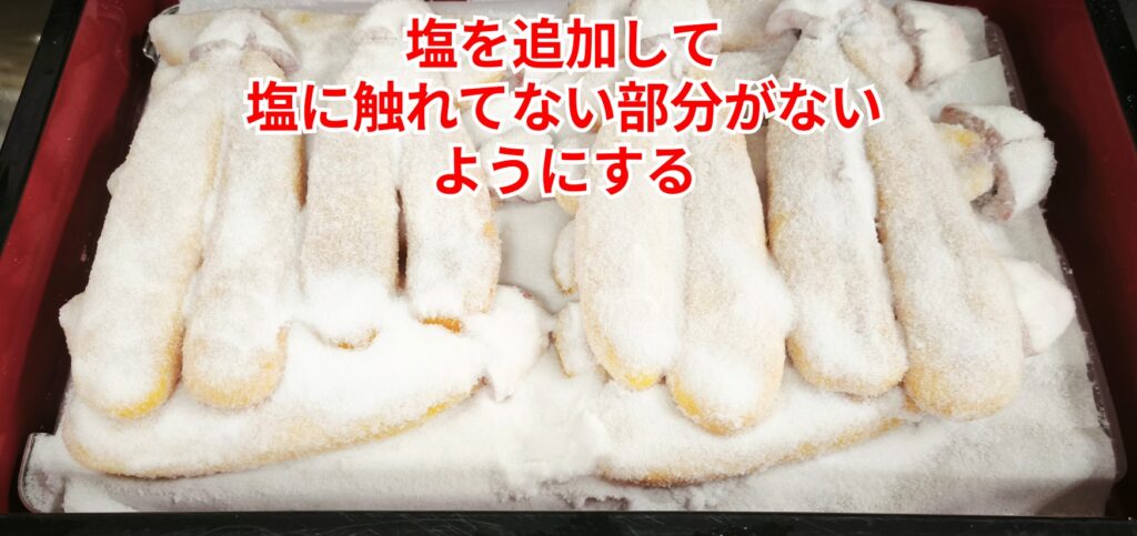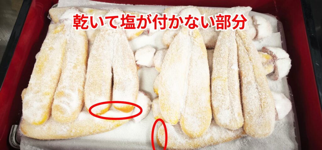表面が乾いて、上手く塩がのらないときは塩を追加して下さい。塩を使いすぎてもったいない気がするのも理解できますが、ケチると失敗しやすくなります。