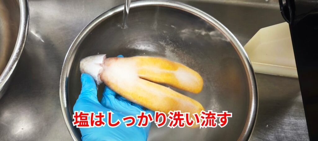 数日間、塩漬けをする場合はここで塩抜きの工程があるよ。