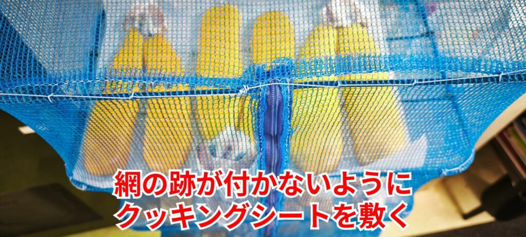 焼酎から上げて、軽く拭き取り、虫除けの「干しカゴ」に並べます。カゴの網目が付かないようにクッキングシートを下に敷きます。