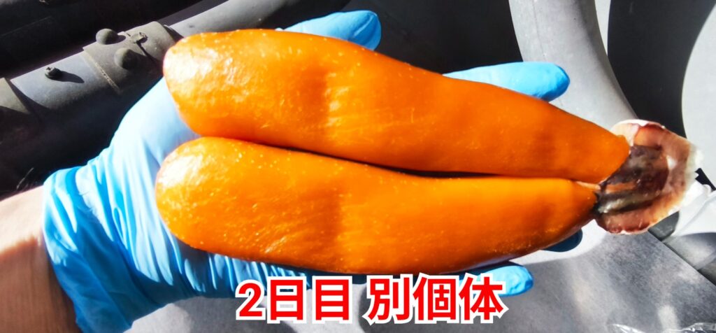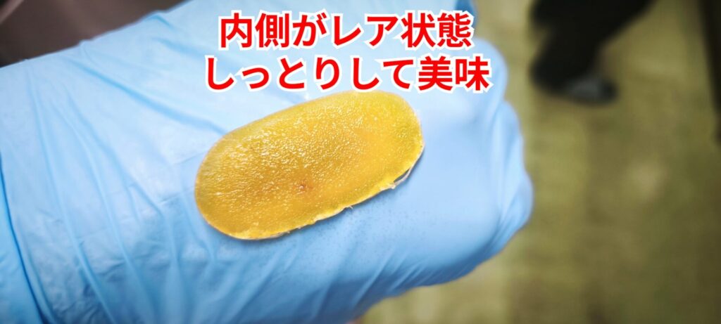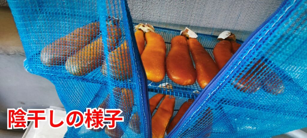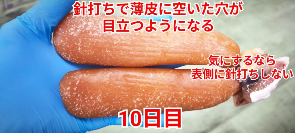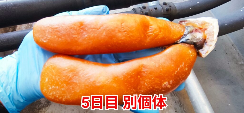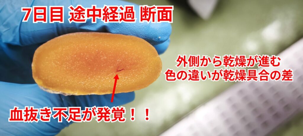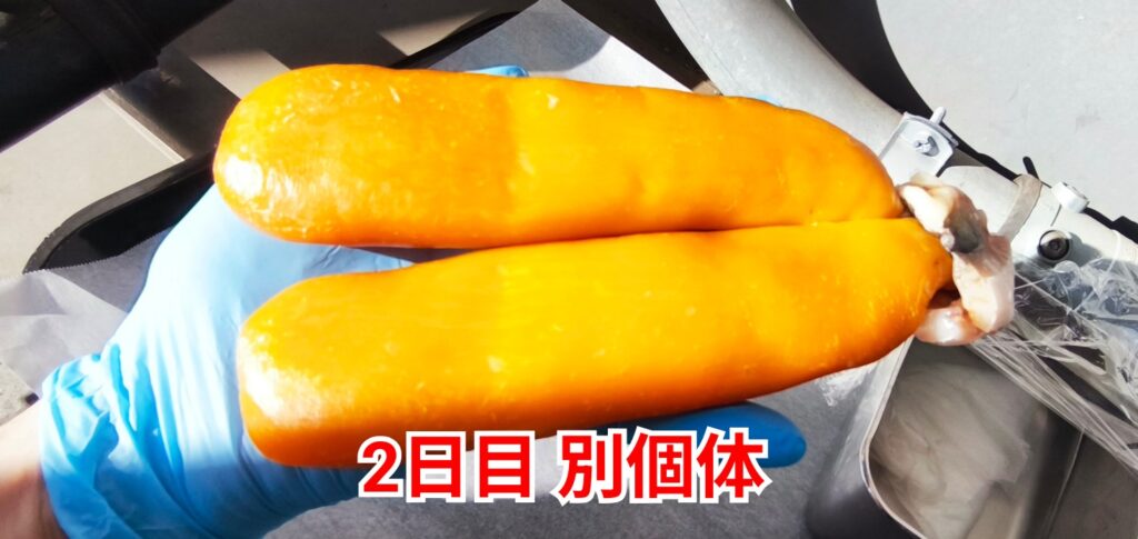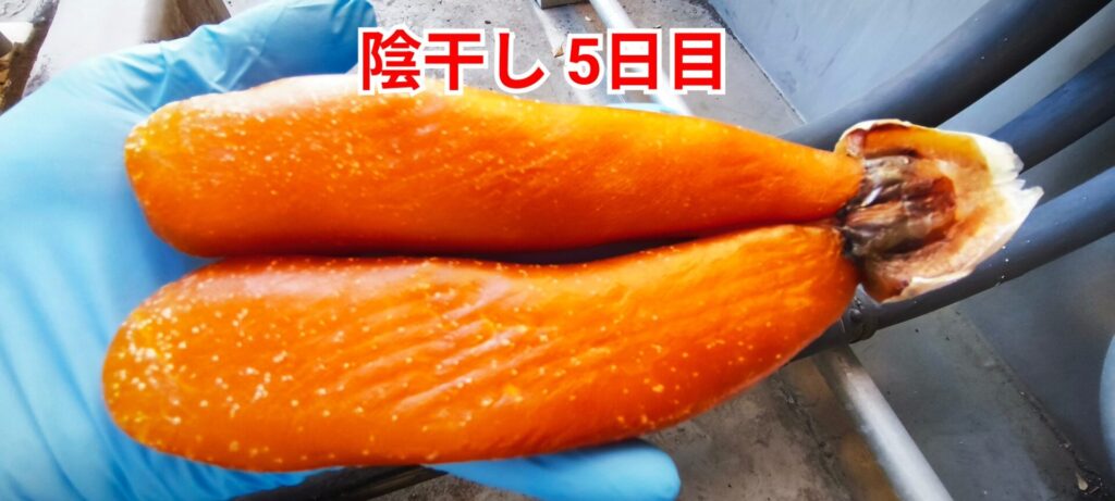 重しの工程をしないと、卵巣内から大量に水分が出てきます。その場合、3時間では脱水が足りないため一晩〜数日間塩漬けしたままにします。