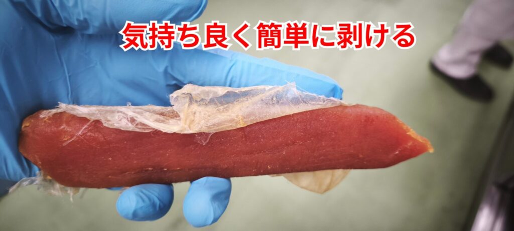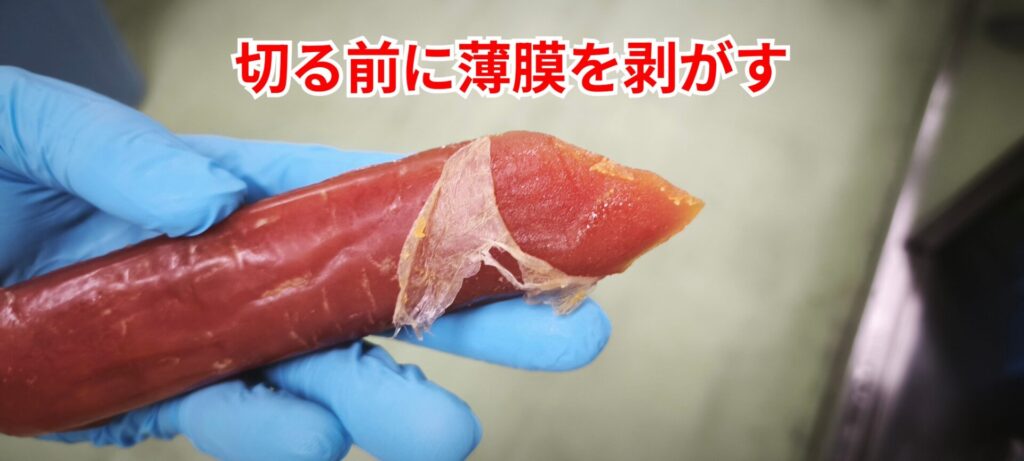 実際にからすみを食べる際には、薄皮を剥がして、包丁します。