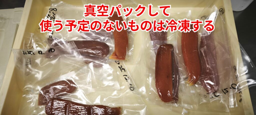 塩分も控え目、乾燥加減も控え目であるため、すぐに使う予定のない分は真空パックして冷凍します。