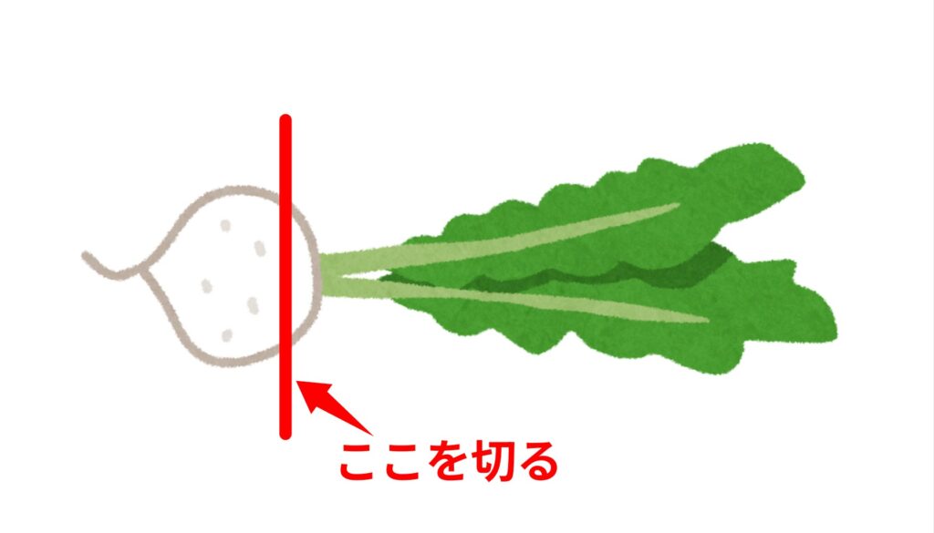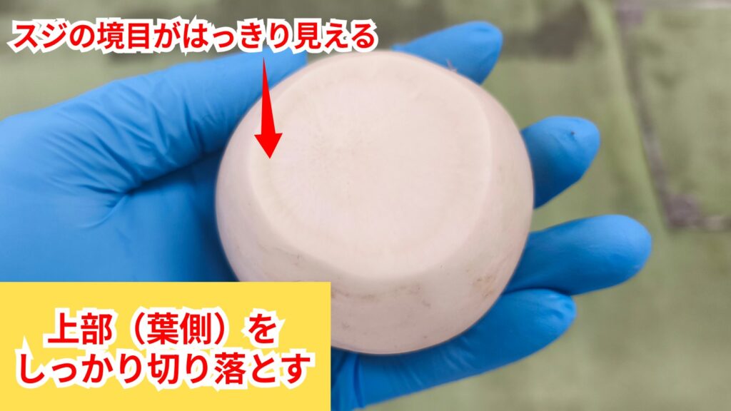 葉の部分をしっかり切り落とし、皮の内側のスジがしっかり見えるようにします。