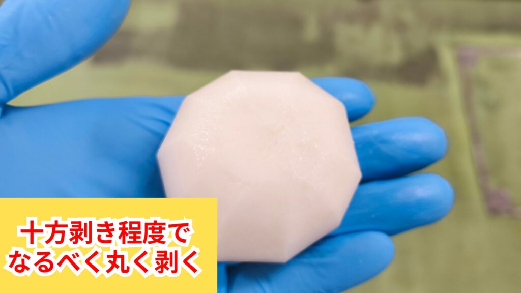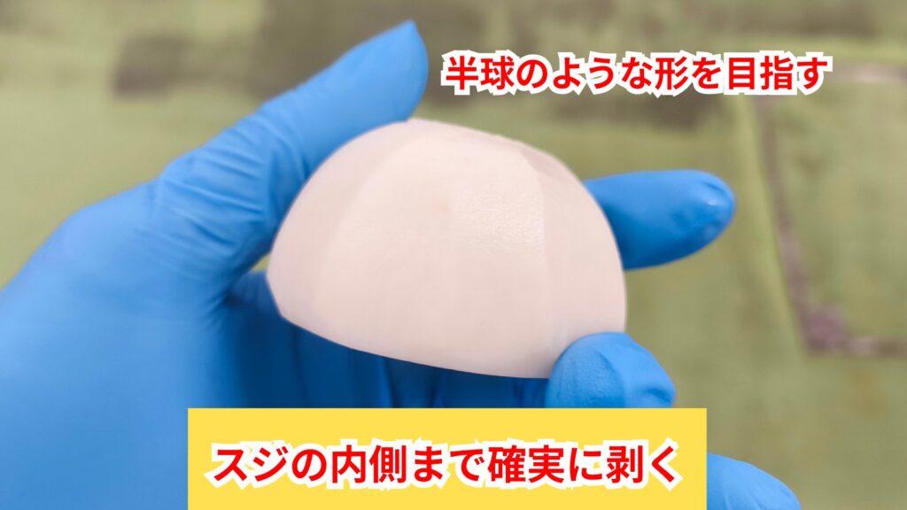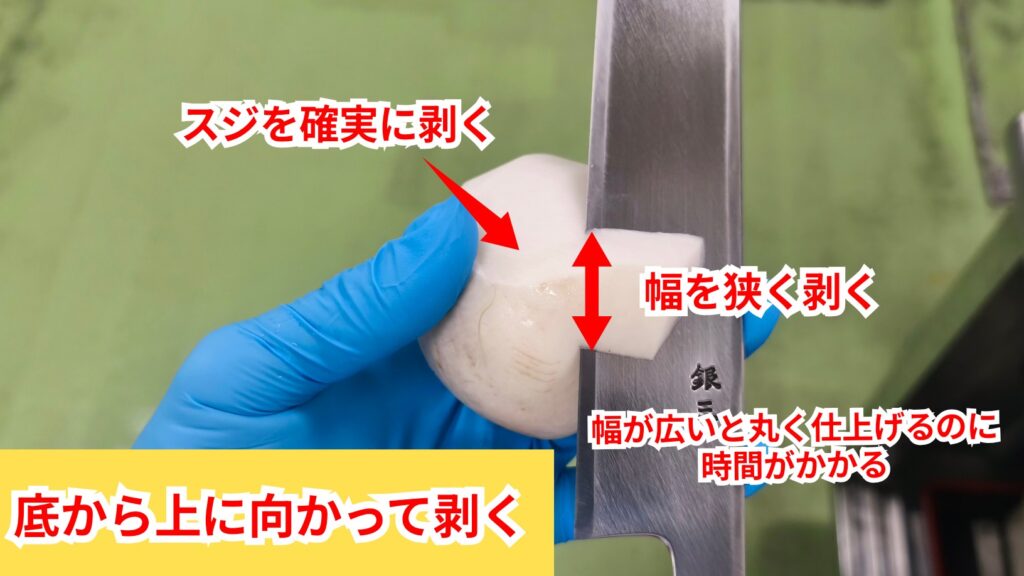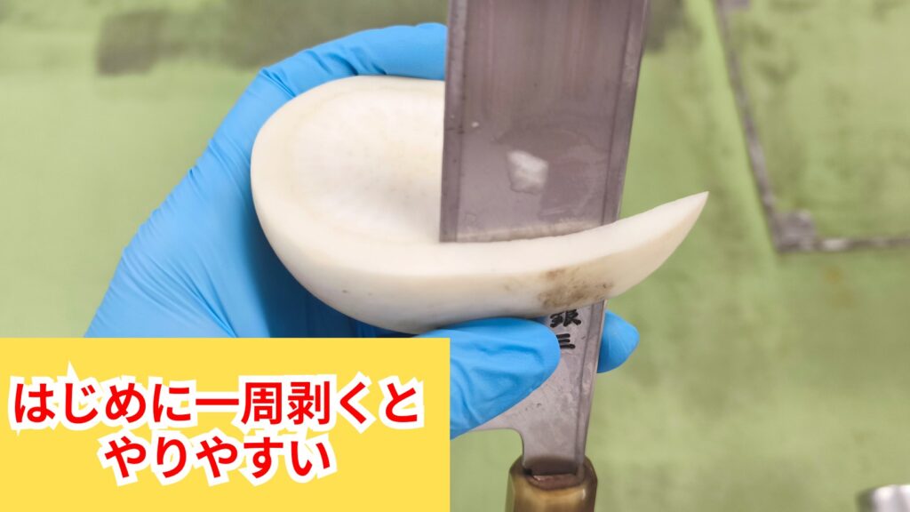 この後、丸く仕上げるためにできる限り幅を狭めに剥いて下さい。