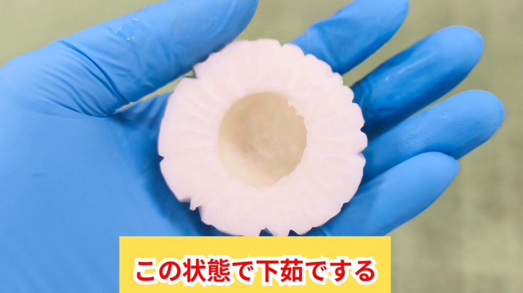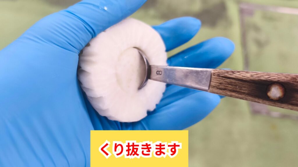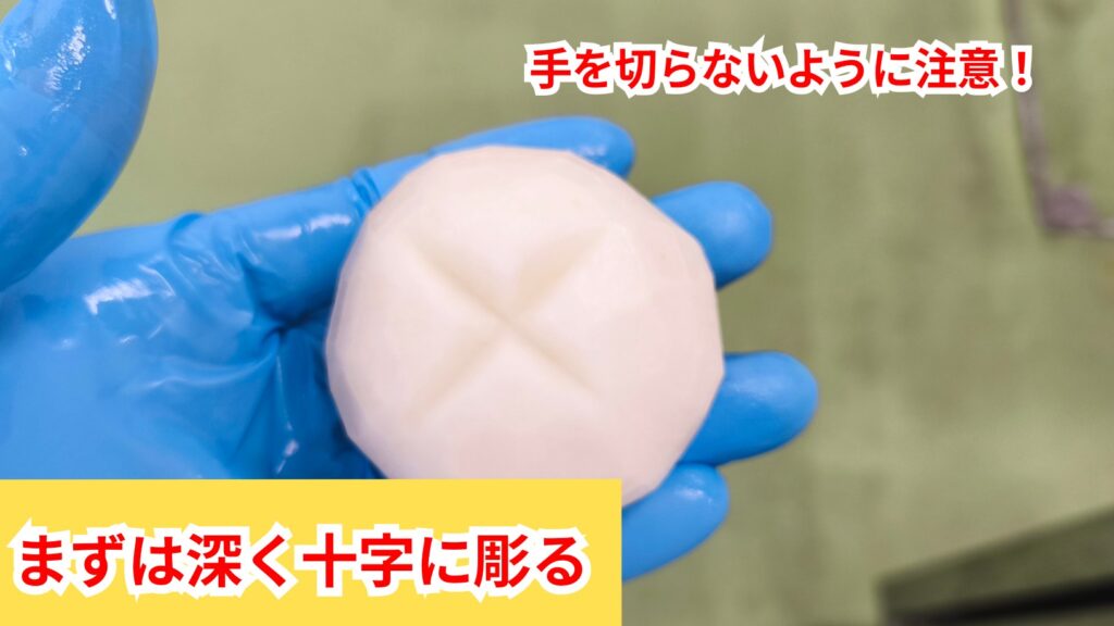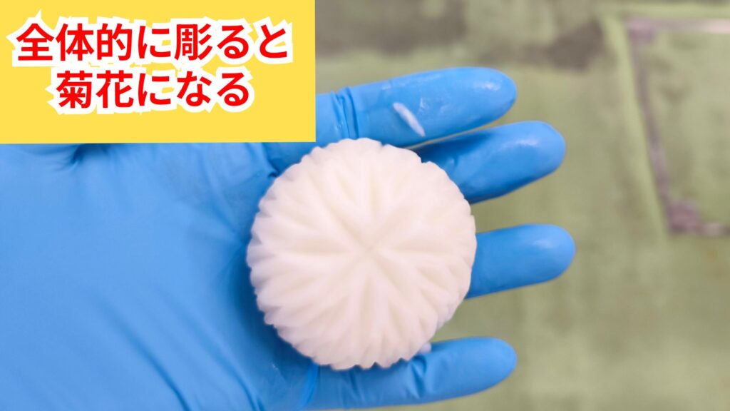 先輩、菊花蕪って、こんなに手間がかかるんですね……。彫り込みの数、途中でわからなくなっちゃいました。
