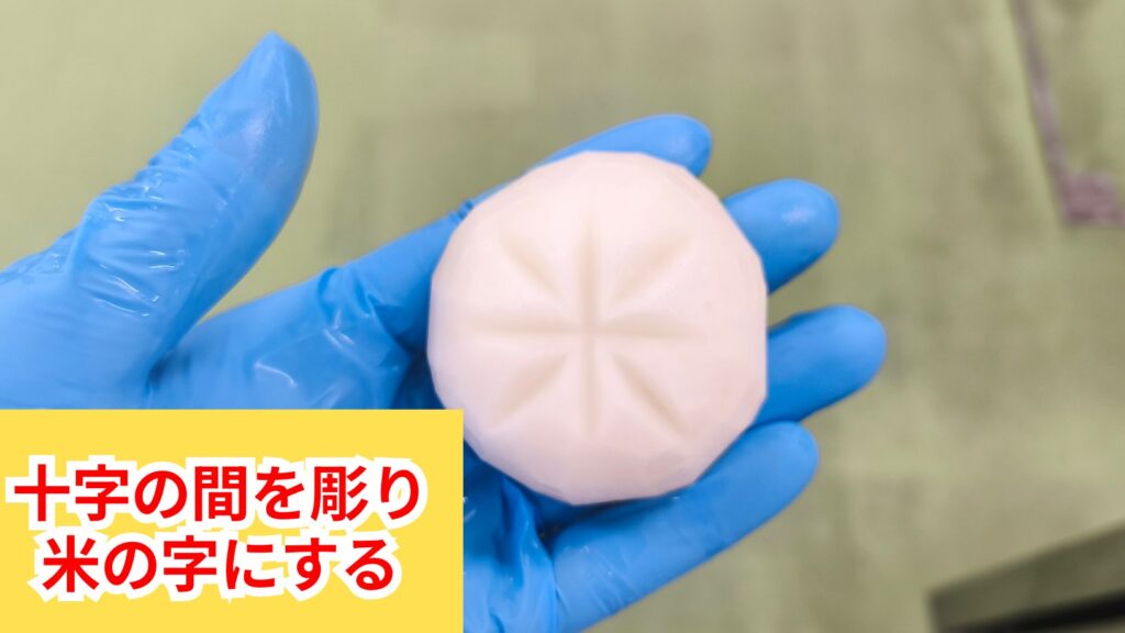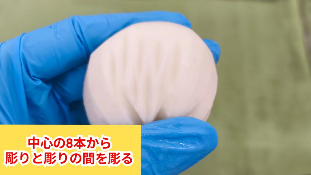 野菜に彫りをいれる際は、深めに彫ることを意識します。メリハリを付けはっきりと線が見えるように。