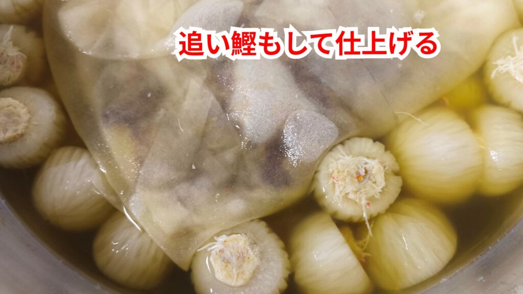 クッキングペーパーに包んだ鰹節で追い鰹をして、さらに炊きます。