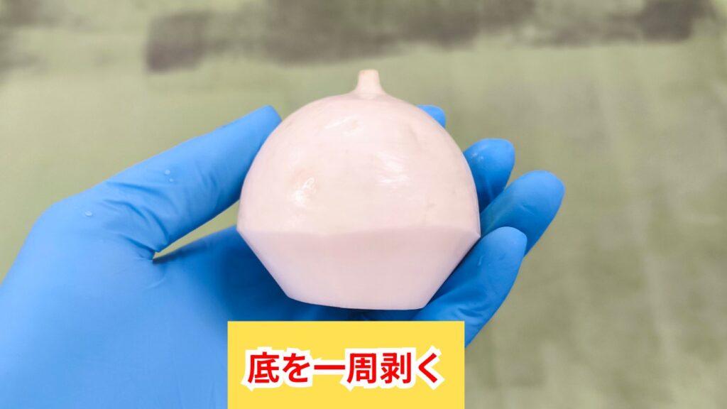 六方剥きの要領で、底面から天面に向かって剥いて下さい。10〜12回ほどで一周剥くようなイメージです。