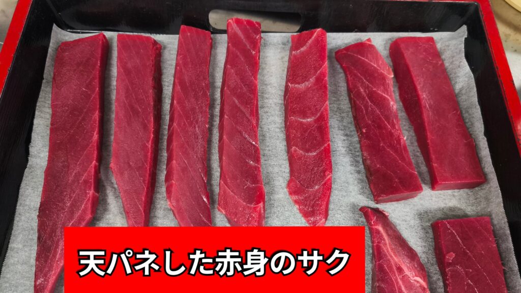 おいらの店ではサク取りの時点で更に半分に切り分け、-60℃の超低温冷凍庫で保管します。