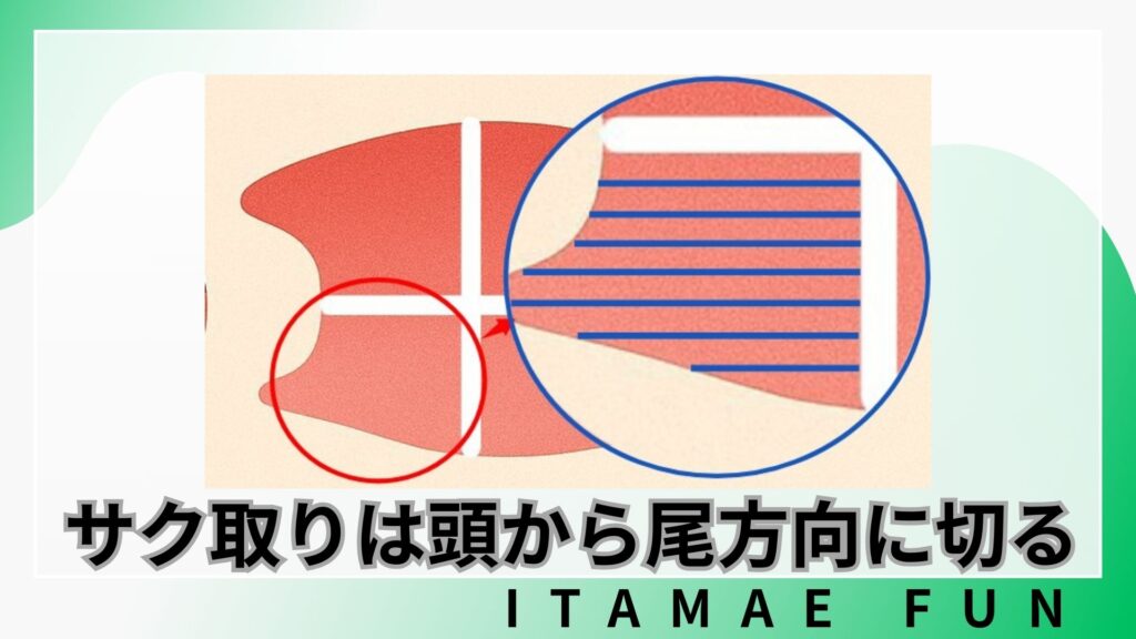 大まかなイメージは、「スジに沿ってサク取りして、刺身にするときにスジを断ち切る」です。